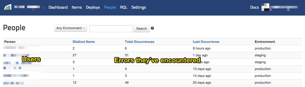 Rollbar automatically captures who the current user is along with their id, name and email address. Knowing which users encountered a problem is so useful in many contexts. For the developer, it makes it easier to spot data integrity problems or problems specific to that user’s account. But the real gem is for customer support. Now you know which users encountered a problem you don’t have to wait for them to reach out to you, you can be proactive.
