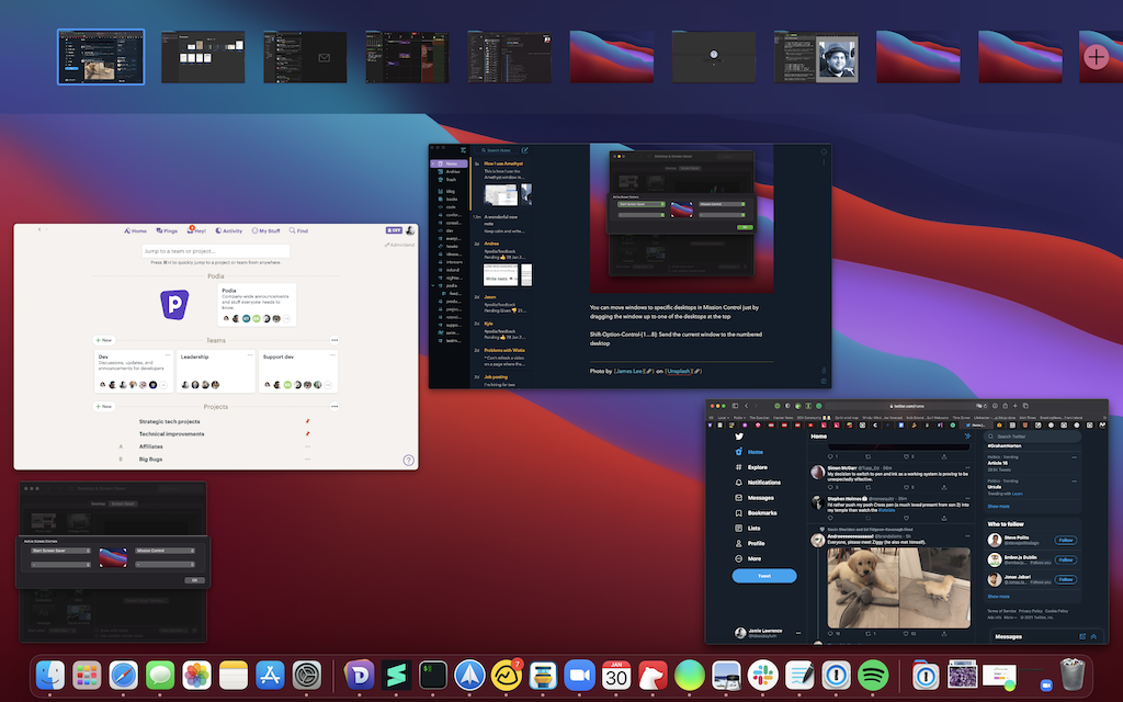 Who knew? MacOS actually has this feature and it works pretty well, though in Apple parlance they are called “spaces”. You can distribute your windows across multiple desktops (I typically have 7-8) which reduces the number of windows on the screen at any one time