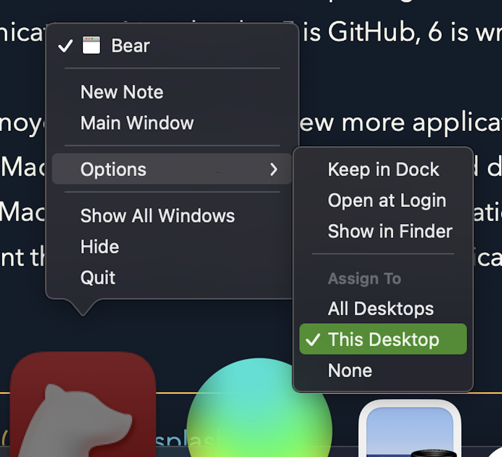 You will start to get annoyed once you open a few more applications or restart the laptop and MacOS screws up your carefully-crafted desktop assignments. No fear, macOS has a solution! Move the application windows to the desktop you want them on, then right-click on the application